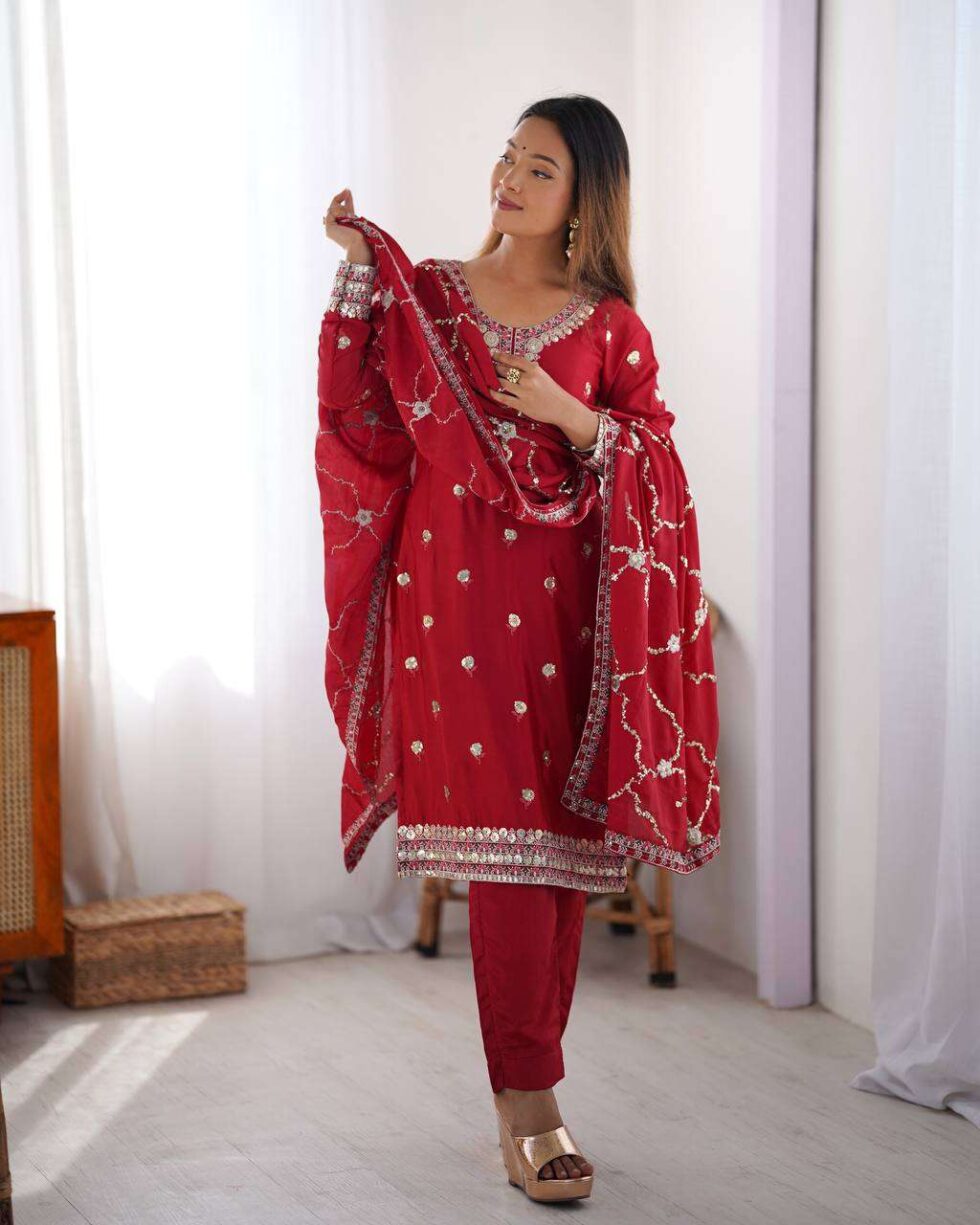 Women’s Chinon Silk Embroidered Straight Kurti with Pant And Dupatta Set